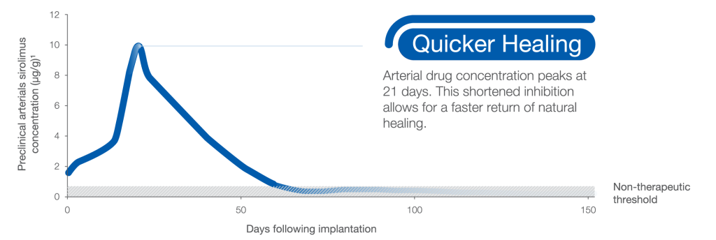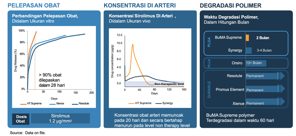 Buma Supreme® Drug Eluting Stent untuk dosis dan kinetic di Desain untuk memberikan Penyembuhan kembali dengan lebih baik dan lebih cepat. penyembuhan yang diberikan menunjukkan hasil yang sangat cepat dan terbaik di kelas nya, hanya dengan 28 hari menunjukkan obat release sebesar 90%.