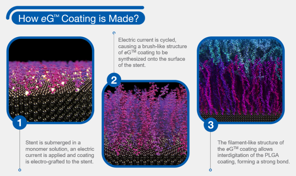 Dengan Patent dari proses electro chemical, eG™ coating (Electro Grafting) adalah lapisan sintesis yang di lapisi pada permukaan stent, diciptakan seperti seperti struktur Filament yang menyatu pada matrix lapisan polimer. Teknik ini Diciptakan agar membentuk lapisan yang kuat ter integritas yang tahan terhadap pengelupasan, pealing, dan retak pada lapisan antara obat dan permukaan stent.